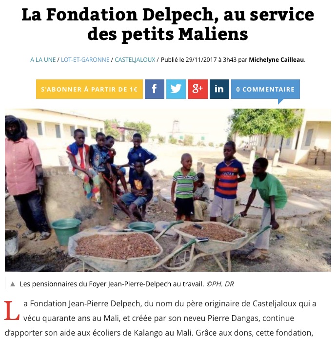 Dans un article publié ce 29 novembre dans son édition du Lot et Garonne, le quotidien Sud-Ouest revient sur les derniers travaux en cours à Kolongo . En faisant ainsi la chronique de la vie du Foyer Jean-Pierre Delpech il permet de maintenir le lien avec les habitants de Casteljaloux dont est originaire la famille Delpech.